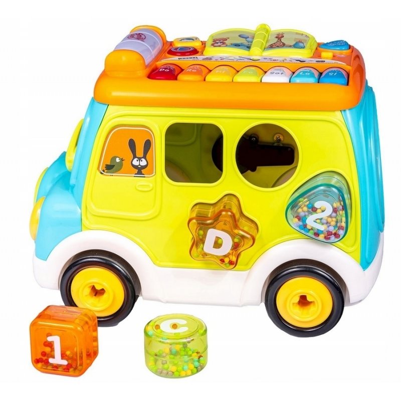 Wesoły autobus mówi po polsku. To zabawka do ciągania, z ruchomymi kołami, które można odkręcać i przykręcać dołączonym śrubokrętem. Posiada ruchome, obracane elementy, grzechotki, koła zębate, piszczek w masce, ruszające się wycieraczki, pianinko, sorter, efekty świetlne. Odtwarza 5 piosenek i odgłosy zwierząt, uczy o światłach drogowych oraz proponuje ciekawą zabawę w rozpoznawanie kształyów po dotyku - włóż klocki do środka autobusu. Następnie włóż rękę do bagażnika i nie patrząc, zgadnij jaki klocek trzymasz. Wesoły autobus zadowoli każdego malucha, a zabawie nie będzie końca! Zabawka wymaga 3 baterii 1,5V (AAA) - dołączono.