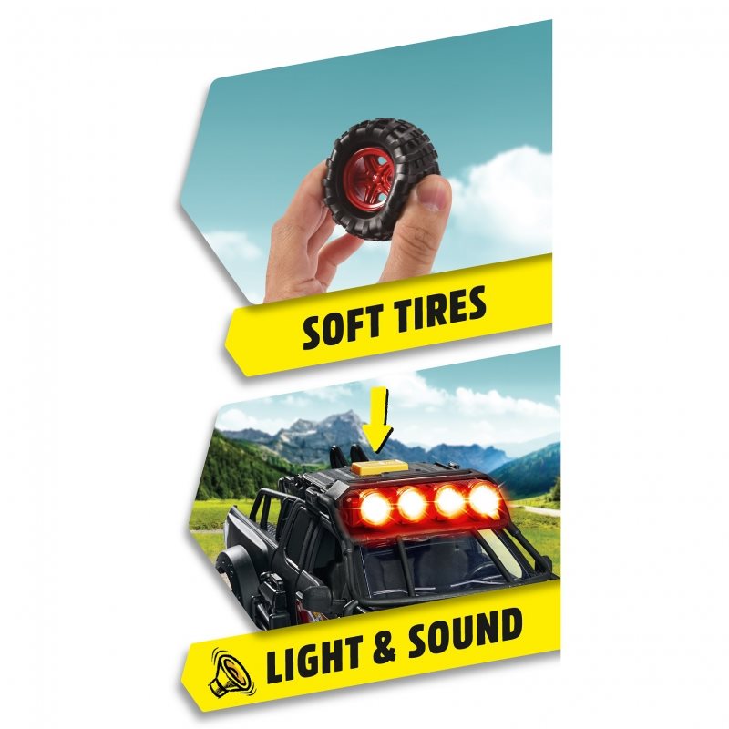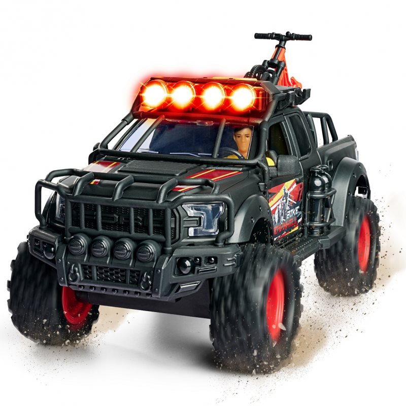 Duże, matowe auto terenowe, z otwieranymi drzwiami i tylną burtą. Na dachu znajduje się przycisk, który uruchamia efekty dźwiękowe i świetlne. Załaduj rower na naczepę, a następnie wyrusz w góry by pokonywać ciekawe i piękne trasy. Zabawka wymaga 3 baterii 1,5V LR44 - dołączono.